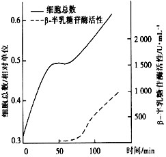 5、选择题 大肠杆菌可以直接利用葡萄糖,也可以通过合成β-半乳糖苷酶将乳糖分解为葡萄糖和半乳糖加以利用。将大肠杆菌培养在含葡萄糖和乳糖的培养基中,测定其细胞总数及细胞内β-半乳糖苷酶的活性变化(如图)。据图分析,下列叙述合理的是