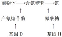 基因D分别决定产氰糖苷酶的合成,d无此功能;基因H决定氰酸酶的合成,h无此功能。现用两个不产氰的品种杂交,F1全部产氰,F1自交得F2,F2中有产氰的,也有不产氰的。用F2各表现型的叶片的提取液做实验,实验时在提取液中分别加入含氰糖苷和氰酸酶,然后观察产氰的情况,结果记录于下表: