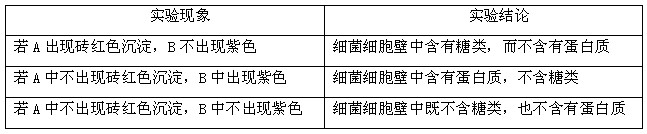 4、综合题 植物细胞壁的主要成分是纤维素和果胶。细菌细胞壁的主要成分是什么?有人认为细菌细胞壁中含有糖类和蛋白质。为探究其化学成分,某课题小组设计了如下实验(已知糖类加硫酸水解后用碱中和,再加斐林试剂加热有砖红色沉淀生成,蛋白质与双缩脲试剂作用,生成紫色物质,且二者单独检验时互不干扰),请补充完善实验。