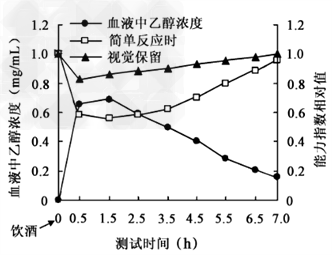 1、连线题 为了研究乙醇对人体神经行为能力的影响,科研人员选取若干自愿者,等量饮用同一种酒,参照世卫组织神经行为能力测试标准,测试短时间反应时(对简章信号作出反应的最短时间)、视觉保留(对视觉信号记忆的准确数)和血液中乙醇浓度。以受试者自身未饮酒时为对照,计算能力指数相对值,结果如图所示。请回答下列问题: