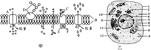1、连线题 下图表示细胞和生物膜结构模式图,图甲中A、B、C、D、E、F表示某些物质,a、b、c、d表示物质进出膜的运输方式,图乙中序号1~12表示细胞的某些结构。请据图回答: