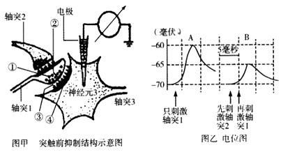 1、选择题 下图中,图甲是运动神经元的突触前抑制机理示意图,图乙是图甲中神经元3受到刺激产生兴奋时的膜内电位变化图。当③中给予某种药物后,再刺激轴突1,发现神经冲动的传递被阻断,但检测到③中神经递质的量与给药前相同。下列说法不正确的是