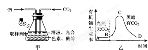 3、选择题 科学家在研究光合作用时,做了一个如下图所示的实验。实验前,他向一个密闭容器的溶液中加进了ADP、磷酸盐、光合色素、五碳糖及有关的酶等(见图甲)。随着时间的推移,绘出了曲线图(见图乙)。下列对此有关的描述不正确的是。
