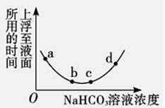 2、选择题 用打孔器在某植物的叶片上打出多个叶圆片,再用气泵抽出叶片内的气体直至叶片沉入水底,然后将等量的叶圆片转至不同浓度的NaHCO3溶液中,给予一定的光照,测量每个培养皿中叶圆片上浮至液面所用的平均时间(如图),以研究光合作用速率与NaHCO3溶液浓度的关系。下列有关分析不正确的是