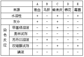 3、综合题 为进一步确定来源不同的A、B、C、D、E五种物质(或结构)的具体类型,进行了下列实验,现象与结果如下: