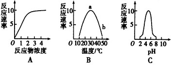 1、连线题 A、B、C三图依次表示酶浓度一定时,反应速率和反应物浓度、温度、pH的关系。请据图回答下列问题。