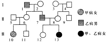 5、选择题 下图为某家族甲(基因为A、a)、乙(基因为B、b)两种遗传病的系谱,其中一种为红绿色盲症。下列叙述正确的是