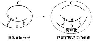 2、选择题 如图表示在胰岛B细胞中,将胰岛素原分子的C段切除后加工成具有活性的胰岛素,并被包装在囊泡中的过程。胰岛素和C段肽链在被排出胰岛B细胞前,一直贮存在此囊泡中。该过程发生的场所应是