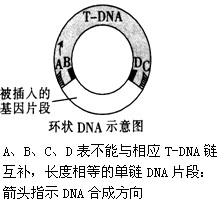 (6)根据T-DNA的已知序列,利用PCR技术可以扩增出被插入的基因片段。其过程是:提取__________植株的DNA,用限制酶处理后,再用__________将获得的DNA片段连接成环(如下图),以此为模板,从图中A、B、C、D四种单链DNA片段中选取_________作为引物进行扩增,得到的片段将用于获取该基因的全序列信息。