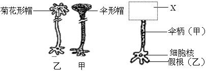 4、选择题 科学家对单细胞伞藻的幼体嫁接:将甲的伞柄嫁接到乙的假根上,请判断图中X“帽”为