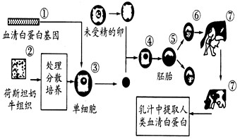 1、连线题 人的血清白蛋白(HAS)在临床上需求量很大,通常从血液中提取但由于艾滋病病毒等的威胁与日俱增,使人们对血液制品顾虑重重。如果应用现代生物科学技术,将人的血清白蛋白基因导入奶牛细胞中,那么利用牛的乳汁生产血清白蛋白就会安全、高效地满足人类需求。下图是利用牛奶乳汁生产人类血清白蛋白的图解,根据下图回答: