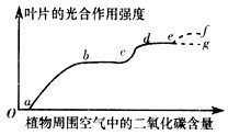 4、选择题 下图表示叶片的光合作用强度与植物周围空气中二氧化碳含量的关系。图示中,ce段是增大了光照强度后测得的曲线。下列有关叙述中,正确的是