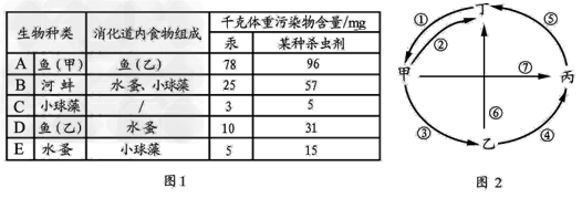 (3)图2为该湖泊生态系统参与碳循环的示意图,甲、乙、丙、丁代表生态系统的4种成分,图中以CO2形式流动的是_________(填序号),①的生理作用主要是_________。从生态系统的成分角度分析,丙属于_________。