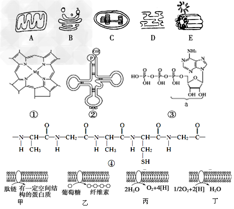 1、连线题 下图中A~E表示5种细胞器,①~④表示从细胞中提取出来的4种有机物(①、④只表示某有机物的局部),甲~丁表示细胞结构中发生的化学反应。回答下列问题(在“[? ]”中填写数字或编号,在“”上填写文字)。