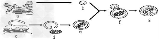 (1)b是刚形成的溶酶体,它起源于细胞器a;e是由膜包裹着衰老细胞器d的小泡,而e的膜来源于细胞器c。由图示可判断:a是________,c是________,d是________。