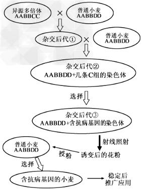 4、连线题 科学家将培育的异源多倍体的抗叶锈病基因转移到普通小麦中,育成了抗叶锈病的小麦,育种过程见图。图中A、B、C、D表示4个不同的染色体组,每组有7条染色体,C染色体组中含携带抗病基因的染色体。请回答下列问题:
