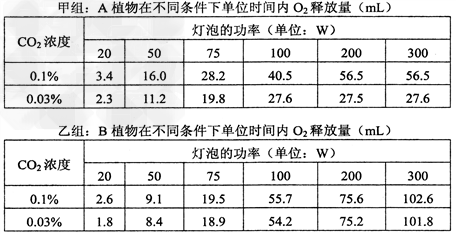 2、填空题 为了探究光照强度和CO2浓度对植物光合作用强度的影响,甲、乙两个研究性学习小组的同学用相同方法、相同装置对A、B两种植物进行了实验,获得的实验结果如下表所示,请据表分析回答: