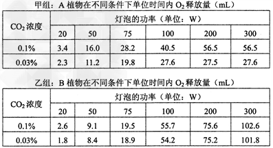 (3)B植物在CO2浓度为0.1%时,若将灯泡功率由300W逐渐增大至400W,请预测O2释放量的变化趋势:_____________________。