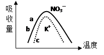 4、选择题 下图是油菜在不同温度下从KNO3溶液中吸收K+和NO3—的曲线。影响a、b两点和b、c两点吸收量不同的因素分别是