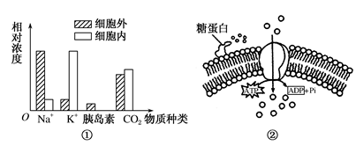 5、选择题 图①表示四种不同的物质在一个动物细胞内外的相对浓度差异。其中不是通过图②所示的过程来维持细胞内外浓度差异的物质是( )