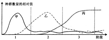 3、选择题 某山区实施退耕还林之后,群落经过数十年的演替发展为树林。下图甲、乙、丙分别表示群落演替的三个连续阶段中,优势植物种群数量变化情况。下列说法中错误的是