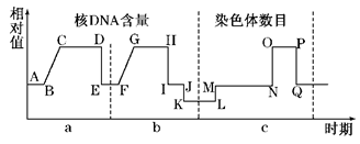 本题解析:试题分析:根据图中核DNA含量和染色体数目的变化可知,a阶段为有丝分裂,b阶段为减数分裂的两次分裂,c阶段为受精作用后的第一次有丝分裂。故①正确;L点→M点染色体数加倍,表示受精作用的完成,受精作用过程有精卵细胞膜的融合,能体现细胞膜的流动性,②正确;GH段细胞中含有的染色体数是2n,OP段着丝点分裂,染色体数加倍为4n,③错误;MN段包括有丝分裂的间期、前期、中期,在间期有DNA的复制,④正确。