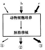 3、选择题 动物细胞培养是动物细胞工程的基础,如下图所示,a、b、c表示现代工程技术,①②③表示其结果,请据图回答,下列说法正确的是
