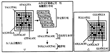 1、选择题 基因芯片的测序原理是DNA分子杂交测序方法,即通过与一组已知序列的核酸探针杂交进行核酸序列测定的方法。先在一块基片表面固定序列已知的八核苷酸的探针,当溶液中带有荧光标记的靶核酸序列,与基因芯片上对应位置的核酸探针产生互补匹配时,通过确定荧光强度最强的探针位置,获得一组序列完全互补的探针序列。据此可重组出靶核酸的序列TATGCAATCTAG(过程见图甲)。