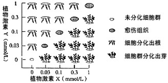 (3)在再分化阶段所用的培养基中,含有植物激素X和植物激素Y,逐渐改变培养基中这两种植物激素的浓度比,未分化细胞群的变化情况如下图所示,据图指出两种激素的不同浓度比与形成芽、根、愈伤组织的关系: