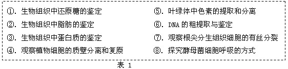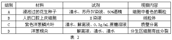 1、填空题  表1为实验内容,某同学将实验材料用相关试剂进行顺序处理,制成临时装片,放在显微镜下观察,如表2所示。回答下列问题: