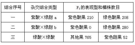 5、连线题 某地开发培育出一种水果,其果皮有紫色的,也有绿色的,果肉有甜的,也有酸的。为了鉴别有关性状的显隐性,用紫色酸果植株分别和绿色甜果植株a、b进行杂交,让一绿色酸果品种自交,结果如下表。请回答: