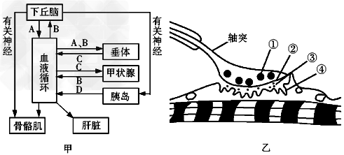 1、连线题  下图甲表示动物体生命活动调节的部分过程,图中字母代表激素;图乙表示的是运动神经纤维末梢和骨骼肌细胞之间的联系。请据图回答: