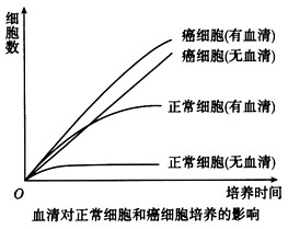 动物细胞体外培养时,通常要在培养基中补充一定浓度的某些物质。下图是血清对正常细胞和癌细胞培养影响的实验结果。从该图提供的信息可以获得的正确结论有