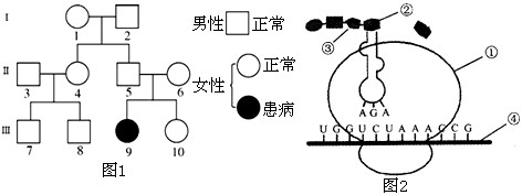 5、连线题 下图1是某家族性遗传病的系谱图(假设该病受一对基因控制,A是显性、a是隐性),图2为该治病基因控制某个酶的过程示意图请回答下面题。