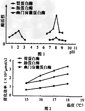 (1)查询资料得知,18℃时,在不同pH条件下大菱鲆消化道各部位蛋白酶活性如图1。由图可知,在各自最适pH下。三种蛋白酶催化效率最高的是___________。