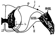 5、选择题 下图为膝跳反射的反射弧结构示意图,a、b、Ⅰ、Ⅱ为反射弧相应结构上的不同位置。若在Ⅰ处施加一个有效刺激,则