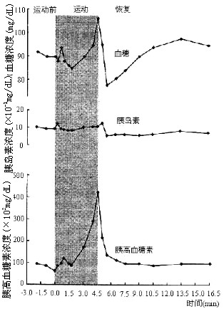 3、连线题 正常情况下,狗的血糖含量维持在90mg/dL左右。在运动前后,狗的血糖及相关激素的变化如图所示。