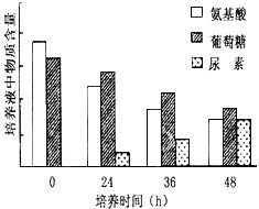 (1)由图可知,随培养时间延长,培养液中葡萄糖和氨基酸含量___________,尿素含量_______________。由于在原培养液中没有尿素,推则其是________________的产物。