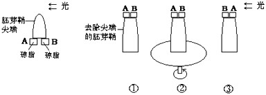 (3)在e组的两块琼脂块中收集到的生长素的量相同,在f组向光侧琼脂块中收集到的生长素较背光侧的少,但两块琼脂块中的生长素总量与在e组的两块琼脂块中收集到的生长素总量相同(对e组和f组的分析必须与上图对应)