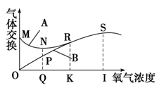 3、选择题 如图表示大气中O2浓度对植物组织产生CO2的影响,其中A曲线代表CO2的释放量,B曲线代表O2的消耗量。贮藏水果时O2浓度应调节到