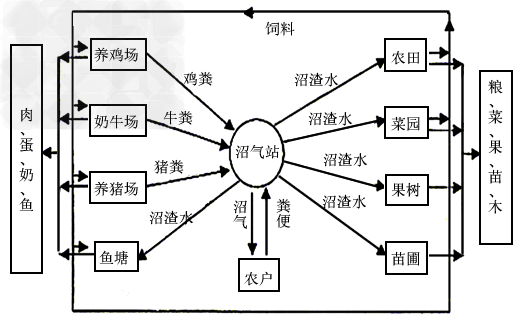 (1)该生态工程以沼气工程为中心,各类植物的秸杆、枝叶用来生产饲料喂养畜、禽、鱼,人、畜、禽粪便作为原料生产沼气,沼渣水返还农田、菜园、果园、苗圃、渔塘,体现了生态工程的_________原理。
