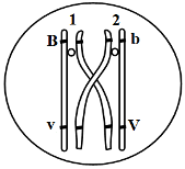 2、选择题 已知基因型为BbVv的雌果蝇在减数分裂过程中发生如右图所示染色体行为的细胞比例为20%。基因型均为BbVv的雌雄果蝇交配,若后代中基因型为bbvv个体比例为0,则表现型为B?_V?_的比例为