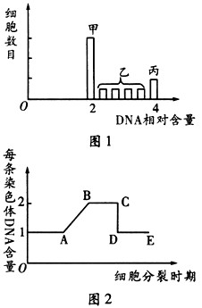 1、选择题 根据每个细胞中DNA的相对含量,将某种连续增殖的动物细胞分为甲、乙、丙三组,每组细胞数如图1所示;根据细胞中每条染色体的DNA含量在细胞周期中的变化绘成曲线,如图2所示。请据图示信息判断,下列结论中与事实不相符的是