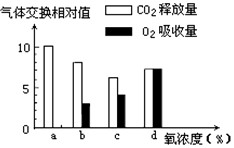 3、选择题 下图表示某绿色植物的非绿色器官在氧浓度为a、b、c、d时,CO2释放量和O2吸收量的变化。下列相关叙述错误的是