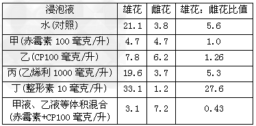 2、选择题 丝瓜为雌雄同株异花植物,将刚萌发的丝瓜种子浸泡在下列5种溶液中24小时,然后种植。比较雄花与雌花平均数,求出性别比,如下表: