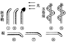 2、选择题 当植物受到环境刺激时,下图所表示的生长素分布与生长的情形正确的是(黑点代表生长素的分布)