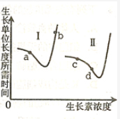 5、选择题 下图表示植物生长单位长度所需时间与生长素浓度的关系,那么