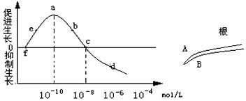 4、选择题 如图所示,如果根A侧的IAA(生长素)浓度在曲线a点(10-10mol/L),下列对B侧IAA浓度范围的描述正确的是