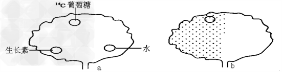 1、选择题 某学者曾做过如图a所示的实验,即在天竺葵的同一叶片的不同部位分别滴加一定浓度生长素溶液、水和14C-葡萄糖,待充分作用后,得到如图b所示的结果,其阴影部分表示具有放射性。下列叙述正确的是: