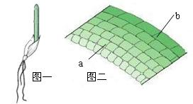 4、选择题 将某植物的胚芽鞘(图一)放在单侧光下照射一段时间,然后取胚芽鞘尖端以下部位制成临时装片(图二),据图得出以下结论,其中错误的是
